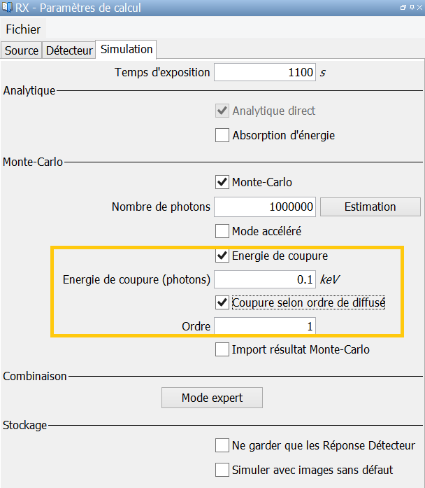 Energie de coupure : En sélectionnant cette option et en rentrant une valeur “seuil” d’énergie, les photons ayant une énergie incidente inférieure à cette valeur ne seront pas pris en compte pour le calcul.