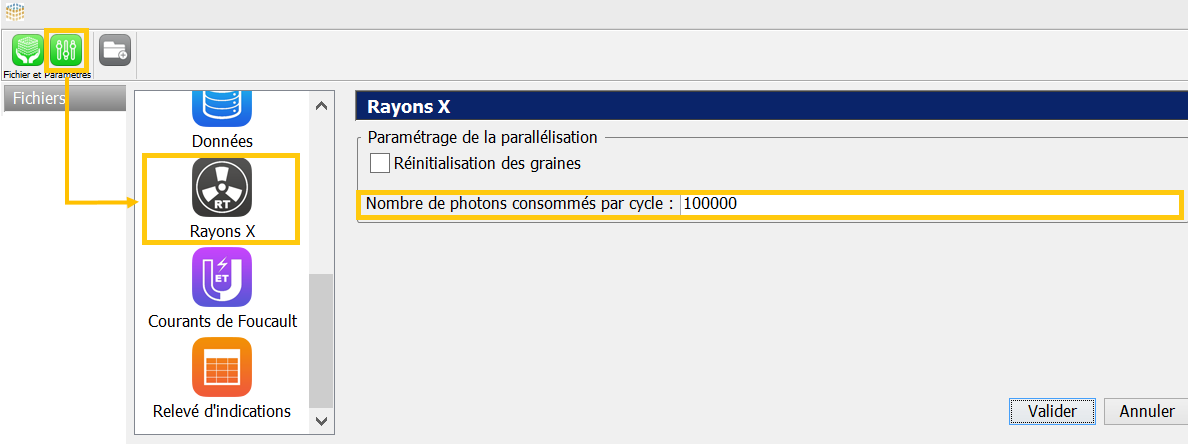 Le calcul Monte-Carlo est séquencé en différents cycles pour lesquels il est possible de définir le nombre de photons considérés. Par défaut, un cycle est composé de 100.000 photons. En augmentant légèrement cette valeur, il est possible de réduire le nombre de cycles calculés pour un nombre donné de photons à simuler, et ainsi de gagner du temps de calcul. Cette option est disponible dans l’onglet “Rayons X” des Préférences.