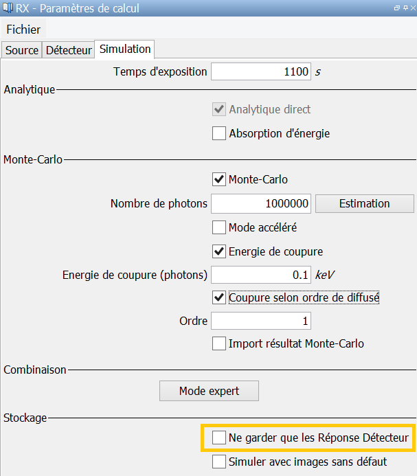 La combinaison des calculs analytiques et Monte-Carlo génère beaucoup d’images qui ne sont pas toujours utiles à l’utilisateur. Quand l’utilisateur n’a pas besoin de voir ces résultats, il a la possibilité de sélectionner l’option “Ne garder que les Réponse Détecteur”. En faisant cela, seules les images “Réponse Détecteur” ou “Densité Optique” sont sauvegardées, et l’espace mémoire alloué à la configuration est significativement réduit (ceci particulièrement en Tomographie, où les résultats peuvent dépasser 100 Go de mémoire).
