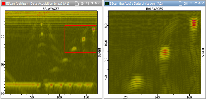 Un rectangle rouge affiche également la limitation sur le B-scan original. La limitation peut être ajustée en déplaçant les limites de ce rectangle ou en entrant des valeurs dans la fenêtre précédente.