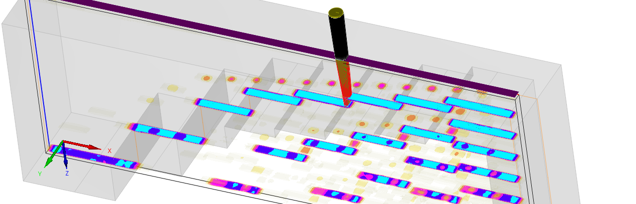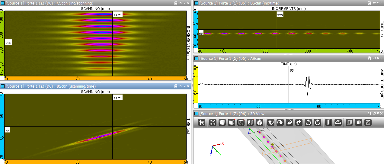 Si vous réalisez des inspections multi-rafales (ou multi-sondes dans le même fichier de donnée), CIVA offre la possibilité de travailler sur ce type de contrôle grâce à des liens entre curseurs et la notion de positionnement de traducteurs sur platine (elle-même positionnée par rapport à la pièce). Il est également possible de combiner les données issues de plusieurs rafales et de visualiser un seul jeu de données correspondant à plusieurs résultats.