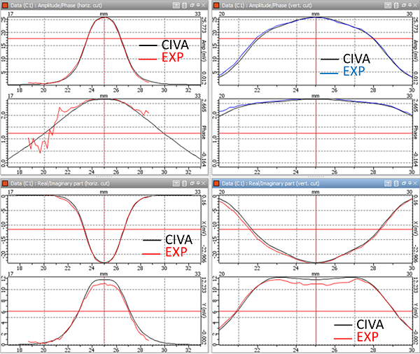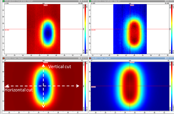 C-scans expérimentaux (en haut) et obtenus avec CIVA (en bas) des parties réelles (à gauche) et imaginaires (à droite)