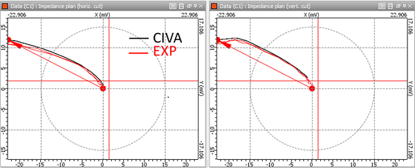 La figure ci-dessous montre les C-scans obtenus avec l’expérience et CIVA. Ils présentent une allure similaire entre expérience et simulation.