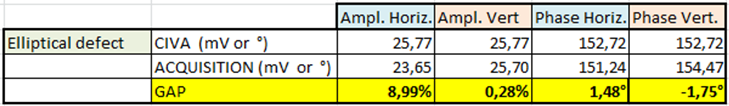 Valeurs maximales des amplitudes, phases correspondantes, et écarts entre CIVA et expériences (références : valeurs expérimentales)