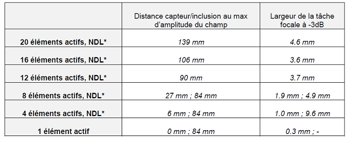 Tableau 1 : Distances capteur/inclusion correspondant au maximum d’amplitude du champ émis dans l’eau sur l’axe du capteur et largeur de la tache focale en fonction de l’ouverture active. Capteur multiéléments avec 20, 16, 12, 8, 4 et 1 éléments actifs, sans loi de retard.