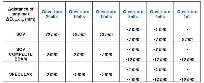 La distance « dmax » à laquelle l’amplitude de l’écho est maximale est très bien prédite avec les modèles SOV-COMPLET et SPECULAIRE pour les ouvertures 16 et 20 éléments. Les écarts n’excédent pas 1mm. La position du max est également bien prédite pour l’ouverture 12 éléments même si les écarts s’élèvent à 5mm. Le modèle SOV a en revanche tendance à surestimer dmax de plus de 10mm avec des écarts pouvant atteindre 20mm pour la plus grande ouverture active.