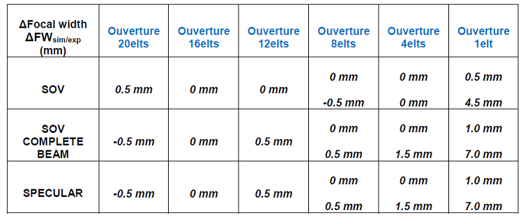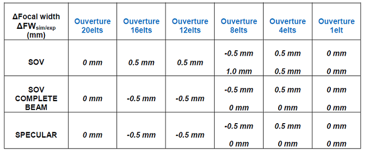 Les écarts entre la simulation et l’expérience sur les taches focales sont affichées sur le Tableau 3 pour les échodynamiques suivant le plan d’incidence du capteur, le Tableau 4 pour les échodynamiques suivant le plan perpendiculaire au capteur.