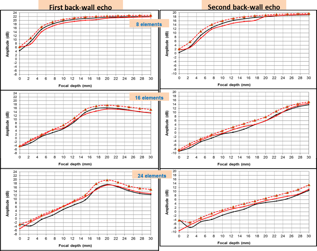 Les résultats sont étalonnés à partir d’un TFP de Ø6 mm, situé à 150 mm de profondeur et une loi de retards nuls. Les amplitudes des 1er et 2ème  échos de fond obtenus pour une loi de focalisation à différentes profondeurs, pour trois séquences d’éléments actifs et à une hauteur d’eau de 25 mm sont tracées ci-dessous en noir pour la mesure expérimentale, en rouge plein pour les résultats du modèle de Kirchhoff et en rouge pointillé pour le modèle spéculaire.