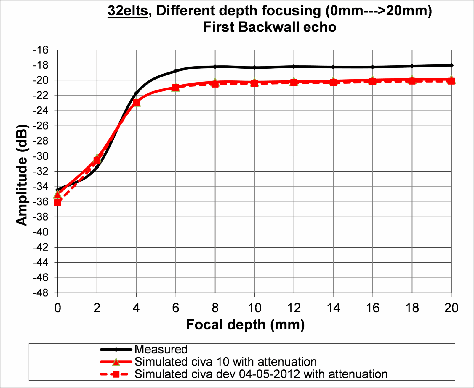 Jusqu’à une focalisation à 4 mm de profondeur, les résultats des deux modèles de CIVA sont en très bon accord avec la mesure. Ensuite les amplitudes sont sous-estimées par CIVA constamment de 2 dB, ce qui reste très proche de la mesure.