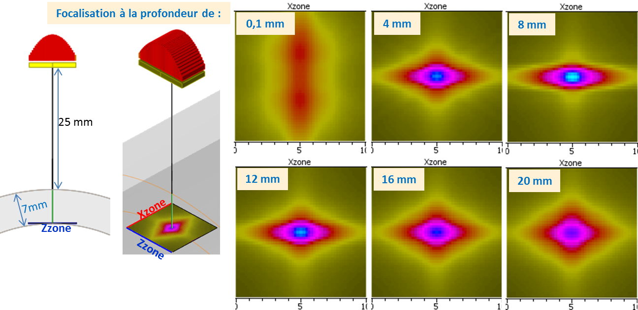La pièce est un tube de diamètre externe de 76 mm et d’épaisseur de 7 mm. L’écho de fond du tube a été mesuré pour des  lois de focalisation en différents points à des profondeurs de 0 mm à 20 mm, par pas de 2 mm, pour une hauteur d’eau de 25 mm et les 32 éléments actifs. Des exemples de champs rayonnés sont présentés ci-dessous.