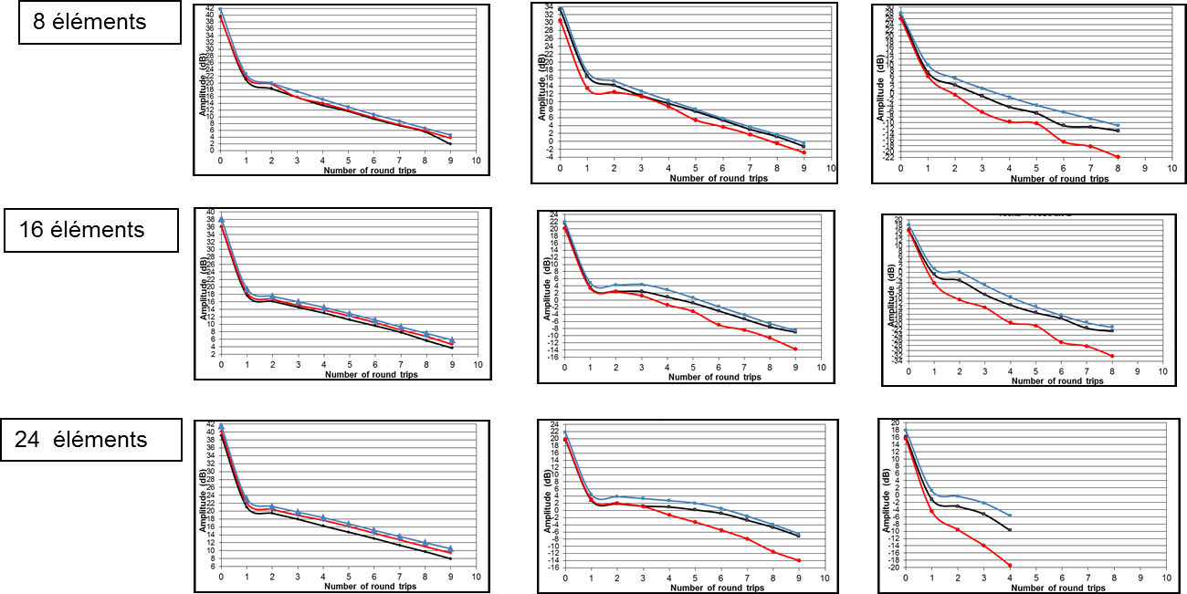 Les résultats sont étalonnés à partir d’un TG de Ø6 mm, situé à 150 mm de profondeur, une hauteur d’eau de 25 mm et une loi de retards nuls. Les amplitudes de l’écho de surface (écho n°0), du premier écho de fond (écho n°1) et des échos de fond suivants sont tracées ci-dessous en noir pour la mesure expérimentale, en rouge pour les résultats du modèle de Kirchhoff et en bleu pour le modèle spéculaire pour les trois angles et trois séquences d’éléments actifs différents.