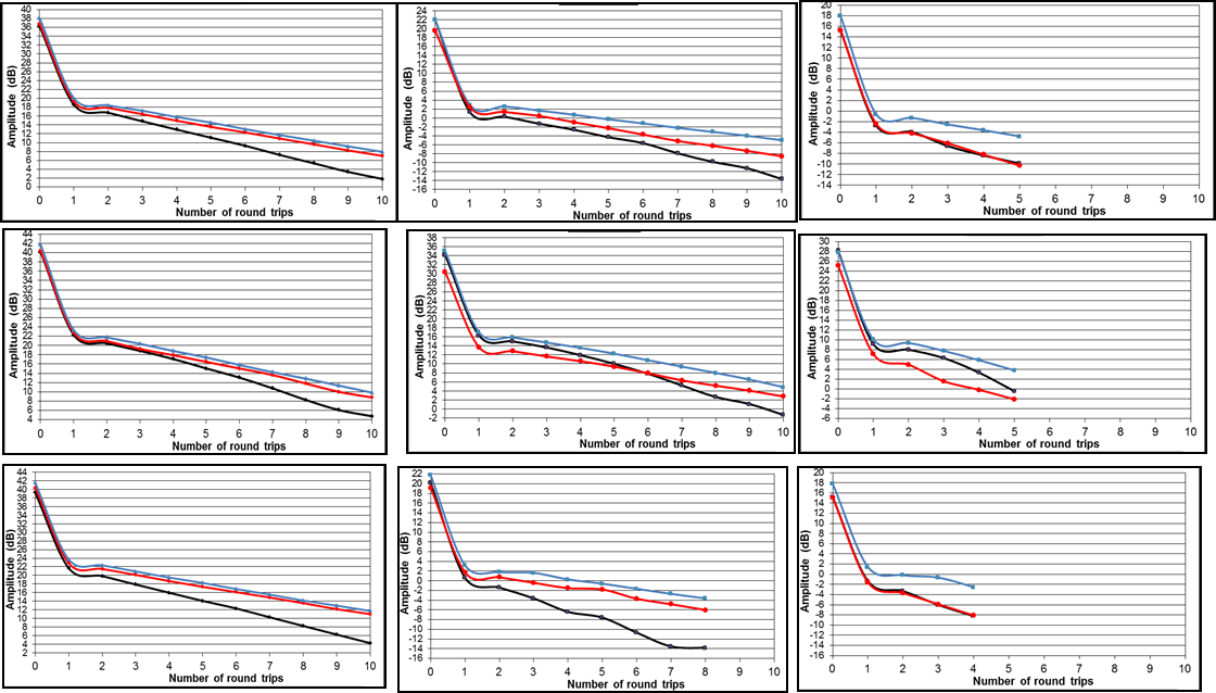 Les Ascans sont représentés ci-dessous dans le cas de la hauteur d’eau de 25 mm, trois incidences de capteurs et pour l’écho de surface et plusieurs échos de fonds. La courbe rouge correspond au modèle spéculaire et la courbe noire aux mesures.