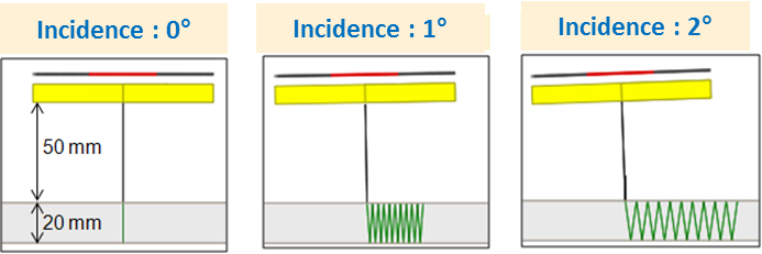 On voit apparaitre entre les échos de fond successifs mesurés, des échos dont les amplitudes augmentent avec l’inclinaison du capteur. Ces échos peuvent être dus à des interférences entre éléments et ne sont pas simulés correctement avec le modèle spéculaire.