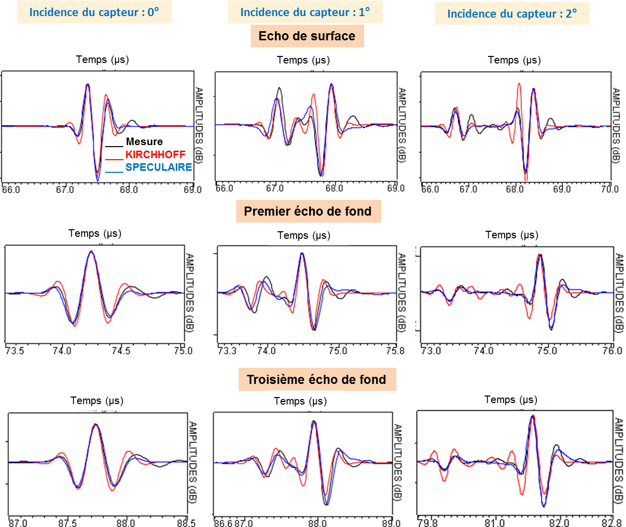 Les Ascans sont représentés ci-dessous dans le cas de la hauteur d’eau de 50 mm pour l’écho de surface et 2 échos de fonds mesurés. La courbe rouge correspond au modèle de Kirchhoff, la courbe bleue au modèle spéculaire et la courbe noire aux mesures.