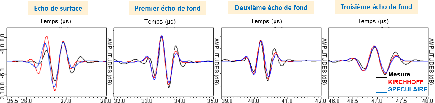 Les Ascans sont représentés ci-dessous dans le cas de la hauteur d’eau de 20 mm pour l’écho de surface et les 3 échos de fonds mesurés. La courbe rouge correspond au modèle de Kirchhoff, la courbe bleue au modèle spéculaire et la courbe noire aux mesures.