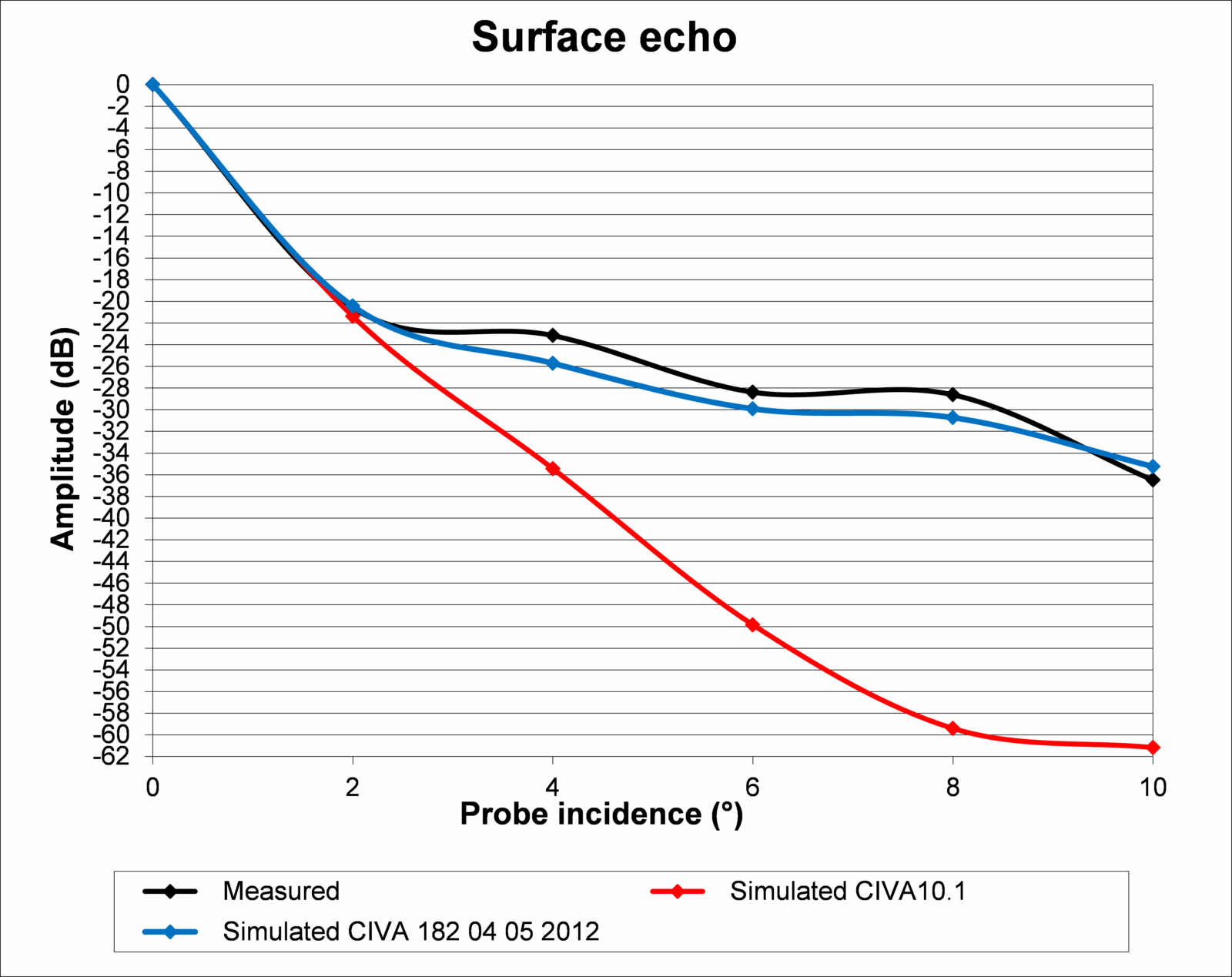 Le modèle spéculaire donne de bien meilleurs résultats que le modèle de Kirchhoff, avec moins de 2dB d’écart avec la mesure, sauf dans le cas d’une incidence du traducteur de 10° pour laquelle on observe un écart de 12 dB. Dans ce cas, l’écho est très faible et de forme très complexe (voir les Ascans ci-dessous). Le modèle de Kirchhoff quant à lui donne de moins bon résultats.