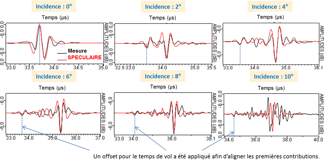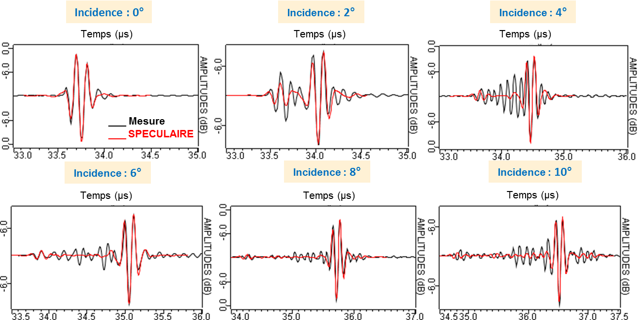 Les Ascans des échos de surface mesurés et simulés avec le modèle spéculaire sont représentés ci-dessous pour six angles d’incidence différents, la courbe rouge correspond au modèle spéculaire et la courbe noire aux mesures.