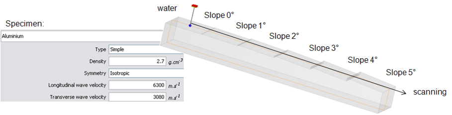 Les différentes surfaces inclinées ont été modélisées dans CIVA par des défauts plans dans une pièce en eau de même dimension et orientation que les paliers de la surface, comme ceci :
