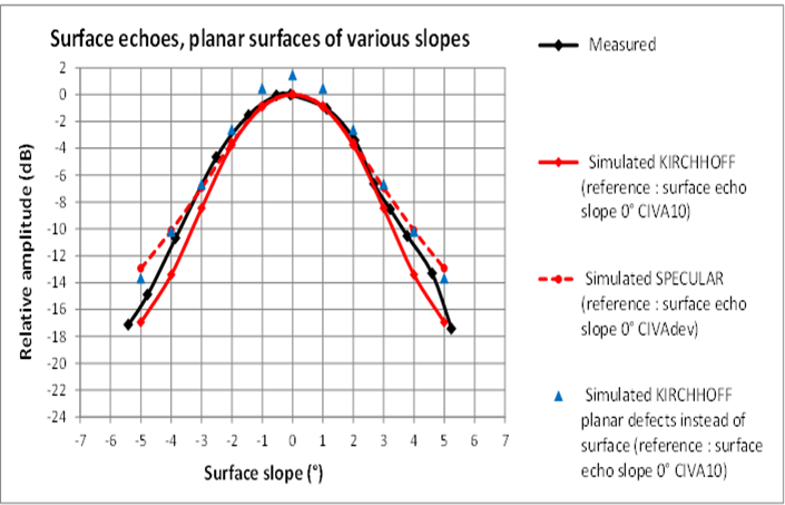 Sur le graphe ci-dessous la décroissance avec l’inclinaison de la surface des amplitudes mesurées de l’écho de surface est bien prédite. On observe également un bon accord entre les amplitudes des échos de surface et celles des échos de défauts plans simulant la surface obtenus avec le modèle de Kirchhoff.