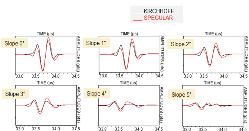 La forme des Ascans des échos de ces surfaces prédits avec les modèles Kirchhoff et Spéculaire sont très proche :