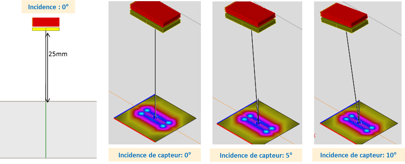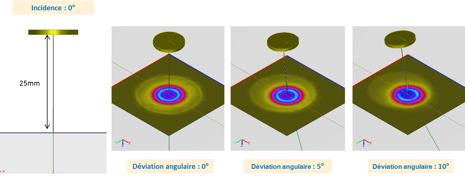 Dans ce cas, l’écho de surface a été mesuré pour des inclinaisons du traducteur de 0° à 10° et une hauteur d’eau de 25 mm. Des exemples de champs rayonnés dans l’eau pour des inclinaisons de 0°, 5° et 10° du traducteur sont représentés sur la figure ci-dessous, sur laquelle on voit que les amplitudes des champs sont comparables.