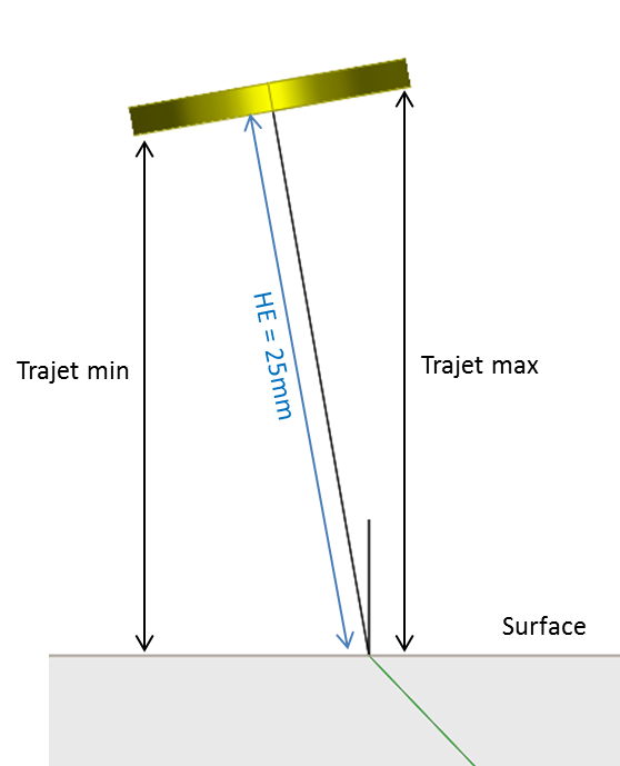 Les signaux simulés par le modèle spéculaire sont en bon accord avec les mesures, sauf pour l’incidence de 10° pour laquelle la forme du signal est très complexe. On remarque qu’à partir de la déviation angulaire de 6°, deux contributions angulaires bien séparées apparaissent. Les temps de vol de ces deux contributions correspondent aux trajets des rayons normaux à la surface de la pièce partant des deux extrémités du traducteur, comme illustré sur la figure ci-dessous.