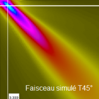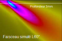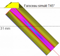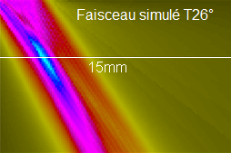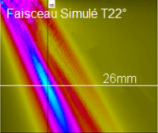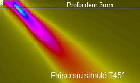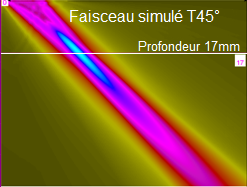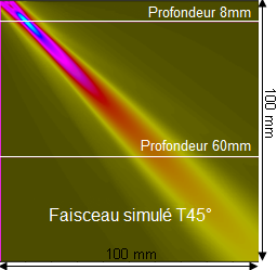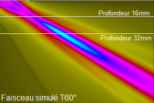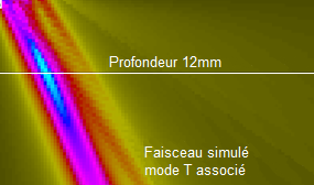 La profondeur focale acoustique est de 3 mm pour le mode L45° et de 12 mm pour le mode T22°, déduite du faisceau simulé illustré ci-dessous.