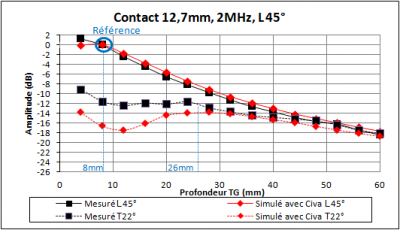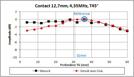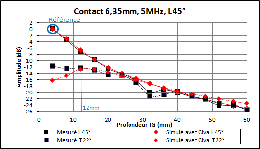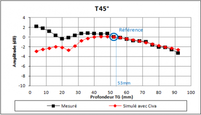 L’écart est inférieur à 2 dB pour le faisceau à 45° en champ lointain, l’accord est bon. Dans la zone du champ proche, le mode T associé avec le mode L45° est sous-estimé par CIVA de 2 à 4 dB.