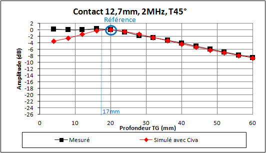 On peut remarquer que la courbe des amplitudes simulées est plus lisse que la courbe des amplitudes expérimentales, ce qui révèle probablement une petite incertitude dans les mesures. Malgré tout, l’accord est bon, l’écart maximal étant de moins de 2 dB, et même de moins de 1 dB entre 20 et 60 mm de profondeur.