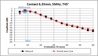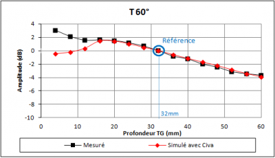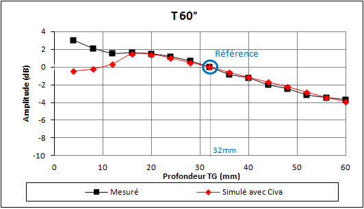 L’hypothèse de forme d’onde non déformée par le défaut, utilisée par les modèles de CIVA, est généralement valable en champ lointain ou dans la zone focale, mais beaucoup moins en champ proche, ce qui conduit à des divergences (moins de 5 dB) lorsque l’on considère des TG en champ proche voire très proche (de 0 à 50% de la profondeur focale).