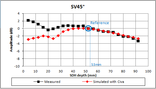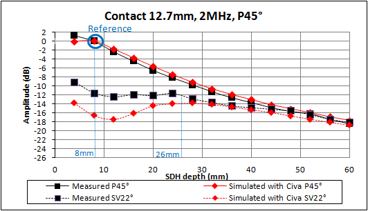 The discrepancy is less than 2 dB for the 45° beam in the far field, there is an overall good agreement. In the near field zone, the SV beam associated with the P45° beam shows a discrepancy between 2 and 4 dB, the simulation underestimates the echo.
