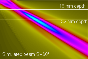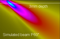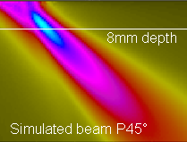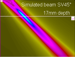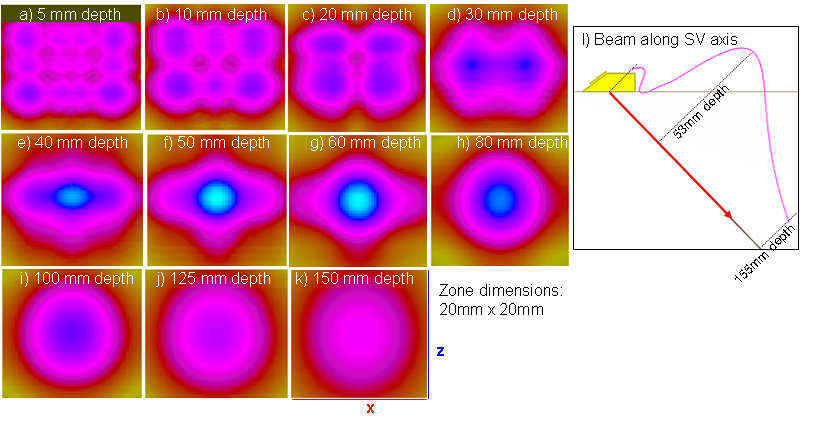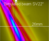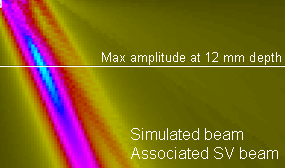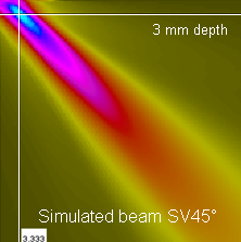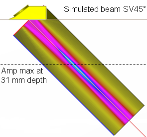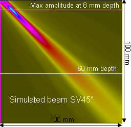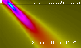 The acoustic focusing depths are 3 mm and 12 mm for respectively the P45° and SV22° modes, deduced from the simulated beam as illustrated below.