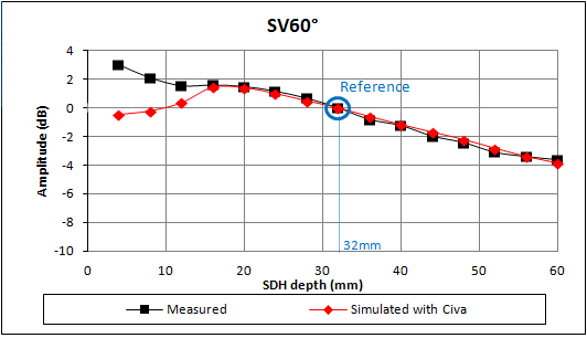The results are calibrated versus the Ø2 mm SDH at 32 mm depth.