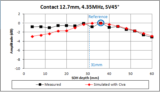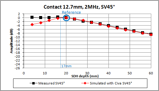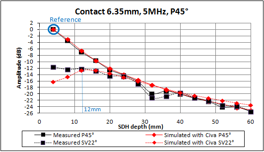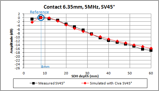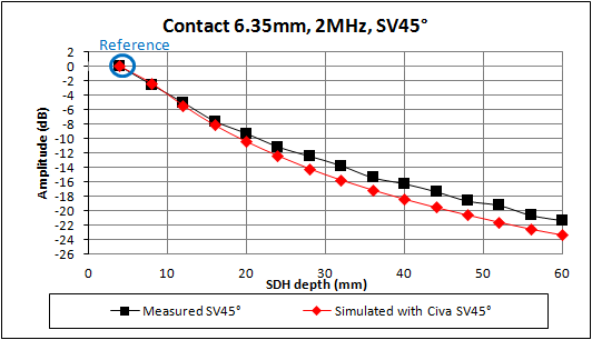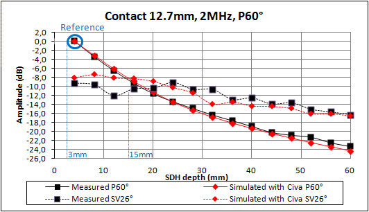 Comparisons between measured and simulated data are also done with contact probes on the steel mock-up with Ø2 mm SDH. The measurements are performed upon a planar steel block containing Ø2 mm SDH from 4 to 60 mm depth with 4 mm steps. As a reminder, the steel parameters are: density 7.9, P waves velocity: 5900 m/s and SV waves velocity: 3230 m/s. Since the SDH are inspected perpendicularly to their axis, the SOV interaction model is considered.