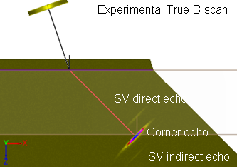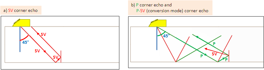 The corner echo corresponds to the double reflection, on the specimen backwall and on the notch, of an oblique incident bulk wave (P or SV wave). Mode conversion can also occur which gives rise to additional corner echoes.