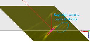 Contributions associated with Rayleigh waves (circled in blue on the figure below) are not calculated with the semi-analytical model of CIVA but they are taken into account in the coupling module CIVA ATHENA 2D. Contributions associated with diffraction are calculated by CIVA but are not studied in this validation work.