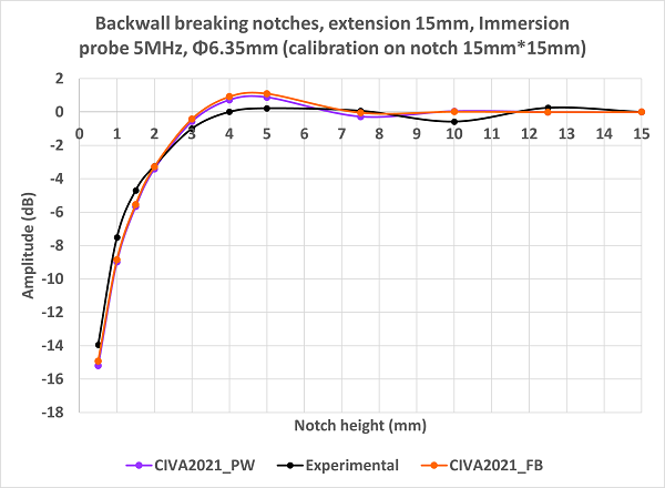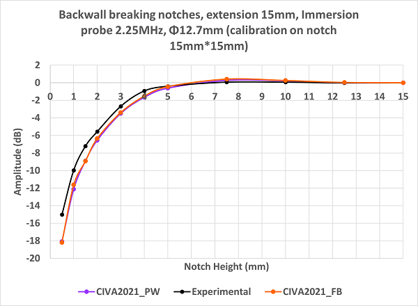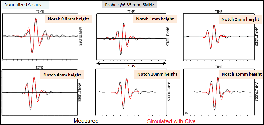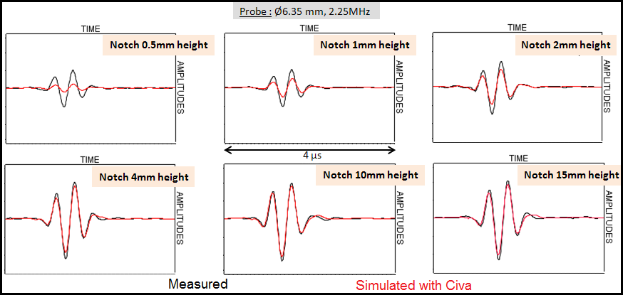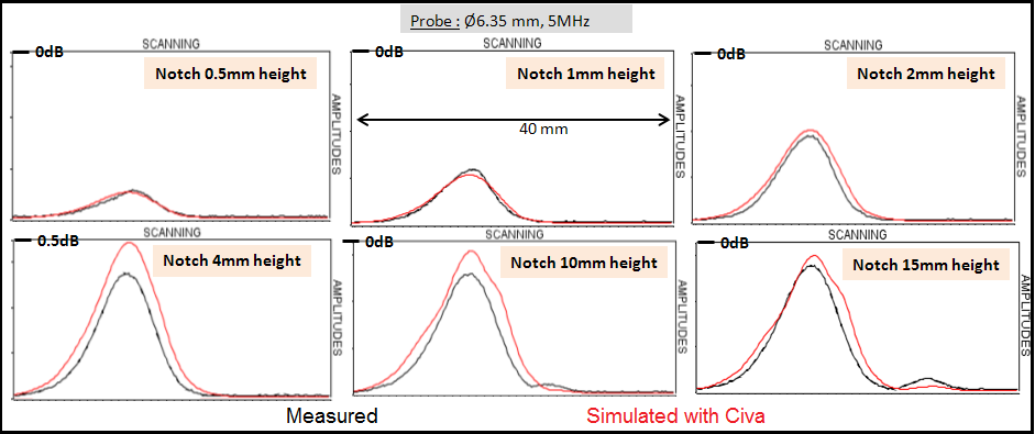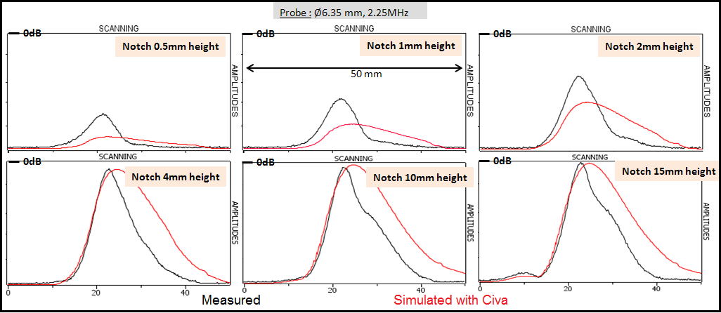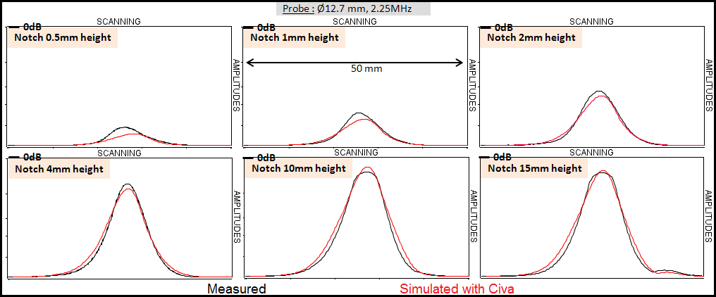 Results obtained with the Ø12.7 mm diameter probe are in good agreement with experiment. The agreement between simulation and experiment is a bit lower for the 0.5 mm high notch (simulated amplitude under-estimated by 3 dB).