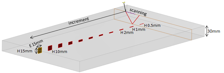 In the following configuration, the specimen is a ferritic steel planar mock-up of 30 mm thickness containing backwall breaking notches. These notches are 15 mm long and have different heights: 0.5 mm, 1 mm, 1.5 mm, 2 mm, 3 mm, 4 mm, 5 mm, 7.5 mm, 10 mm, 12.5 mm and 15 mm.