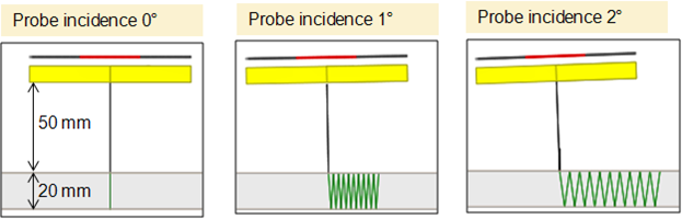 Measurements were performed on two blocks of 5 mm and 20 mm thickness, with 25 mm and 50 mm water path respectively, for three sequences of 8, 16 and 24 active elements and for 0°, 1° and 2° incidence angles. A null delay law has been applied.