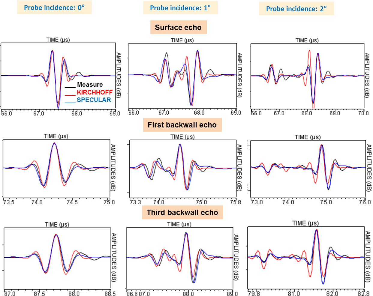 The Ascans are represented here below for the case of 50 mm water path for the surface echo and two measured backwall echoes. The red curve corresponds to the Kirchhoff model, the blue one to the specular model and the black one to measurements.