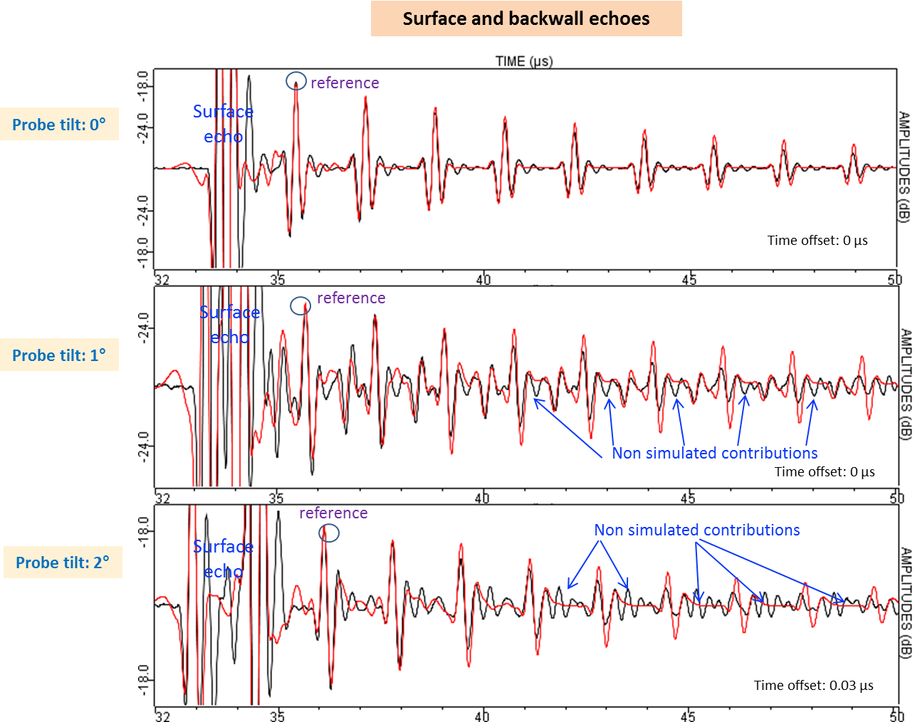 The Ascans are represented here below in the case of a 25 mm water path, three probe’s incidences and for the surface echo and several backwall echoes. The red curve corresponds to specular model and the black one to experiments.