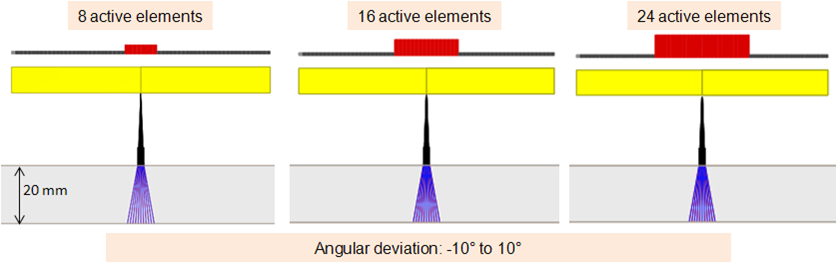 The surface echo of a rectangular block has been measured for a water path of 25 mm, three different sequences of 8, 16 and 24 active elements as is shown on the following figure, and « beam steering » delay laws from -10° to 10°, with 2° steps.