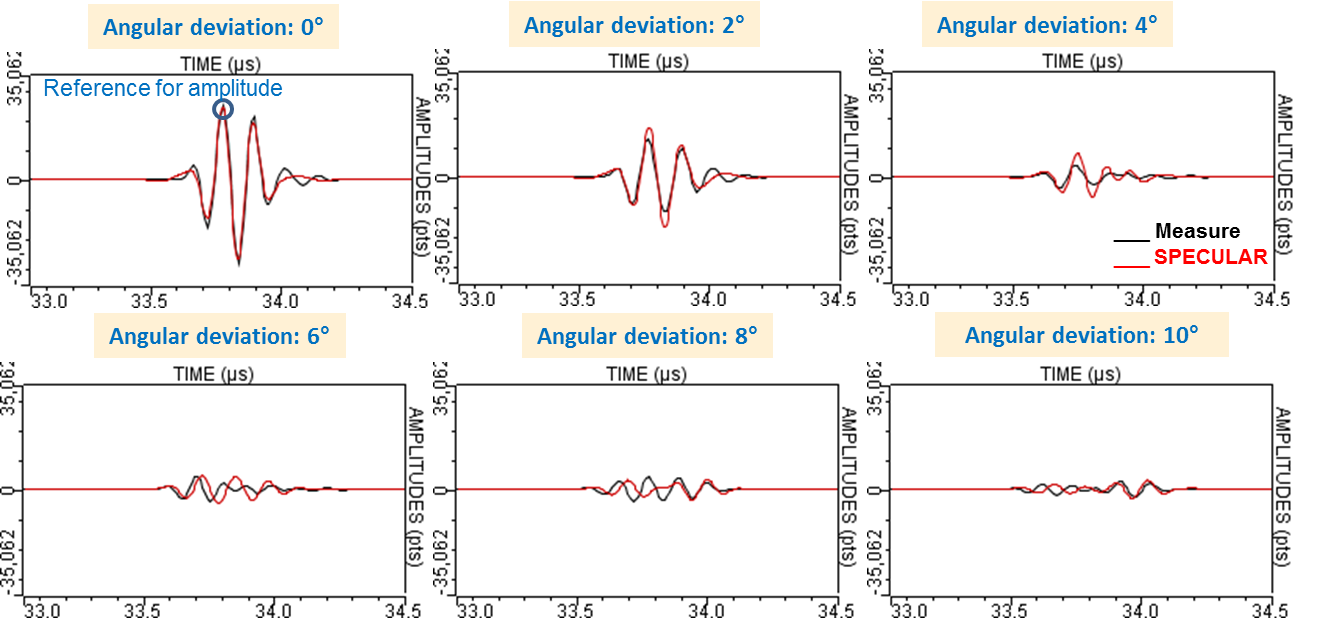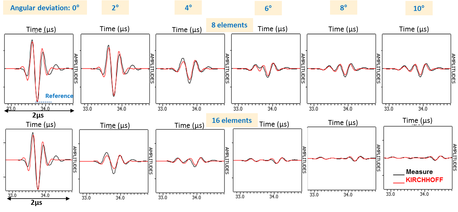 Below are represented Ascan comparisons between Kirchhoff model results and experimental results and between specular model results and experimental results.