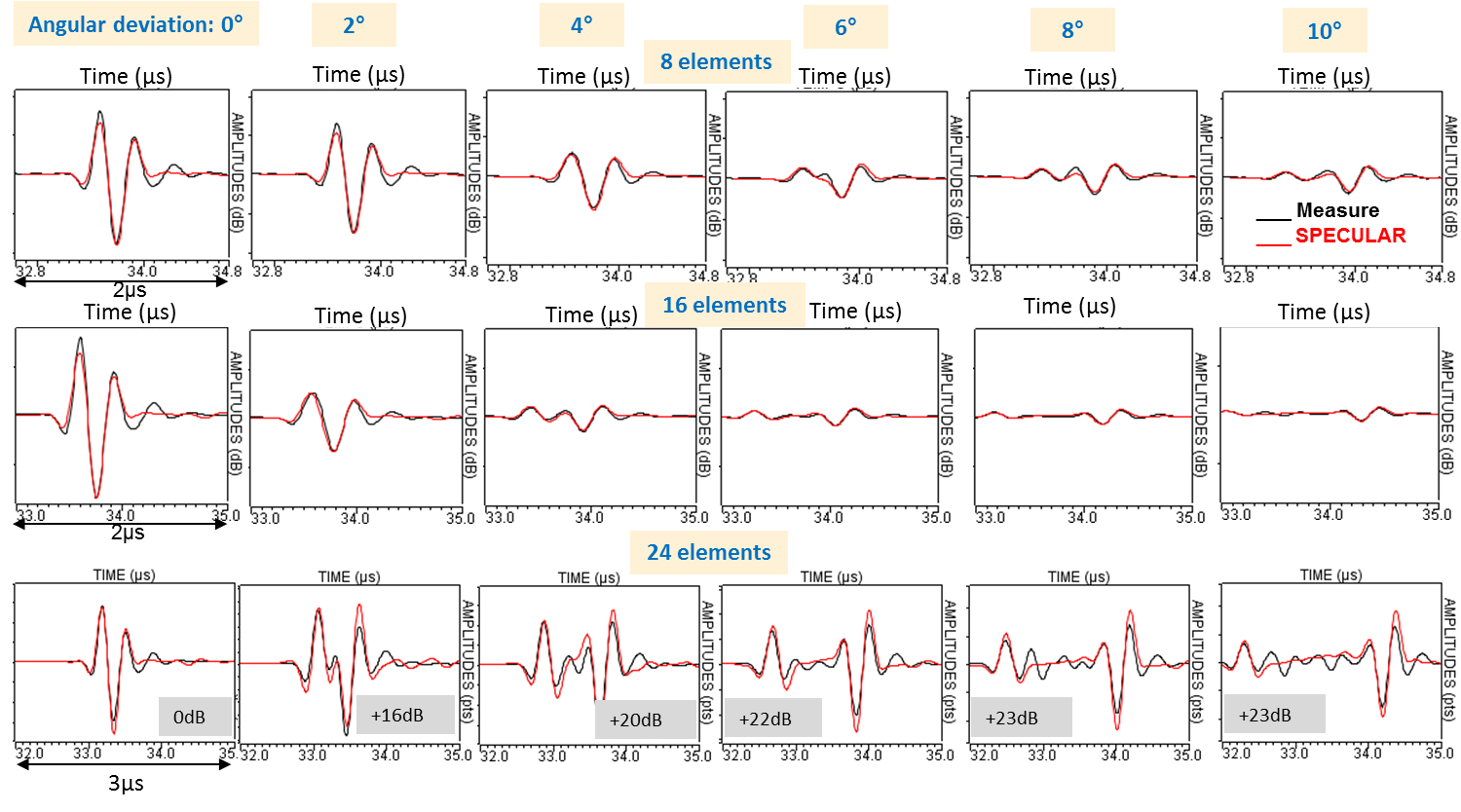 The results are calibrated for a  Ø6 mm SDH, located at 150 mm depth and a null delay law. The amplitudes of surface echoes obtained for a beam steering from -10° to 10°, for three active element sequences and a water path of 25 mm are plotted in black for the measured results, in red for Kirchhoff model results and in red dotted for specular model results.