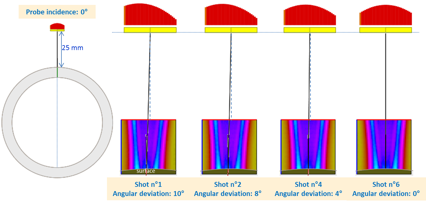 For the first time in this study, the specimen is a tube with an external diameter of 76 mm and 7 mm width, as it can be seen on the figure here below. The surface echo has been measured for deflection laws from -10° to 10°, with steps of 2°, for a water path of 25mm and 32 active elements.