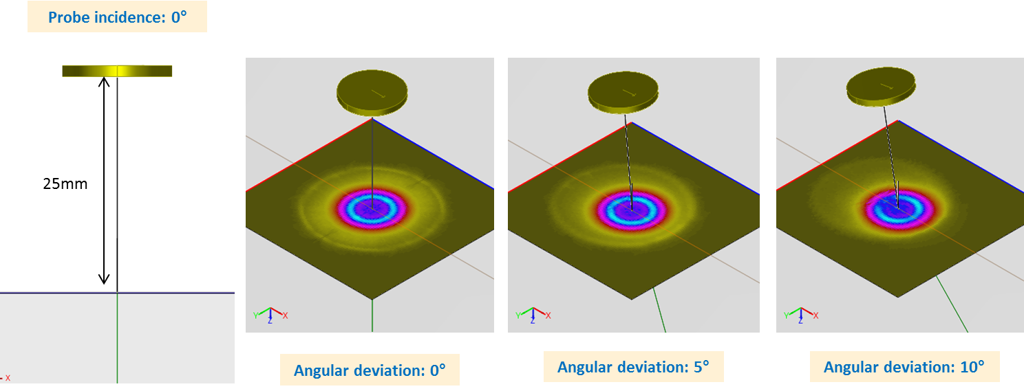The surface echo has been measured for probe tilts from 0° to 10° and a water path of 25 mm. Examples of radiated fields in water for probe tilts of 0°, 5° and 10° are represented on the figure below, on which it can be seen that field amplitudes are comparable.