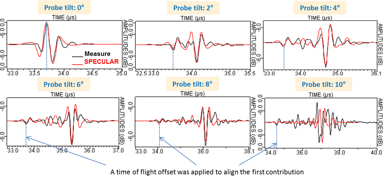 Measured and simulated Ascans with the specular model are represented here below for six different incidence angles; the red curve corresponds to the specular model and the black one to measured results.