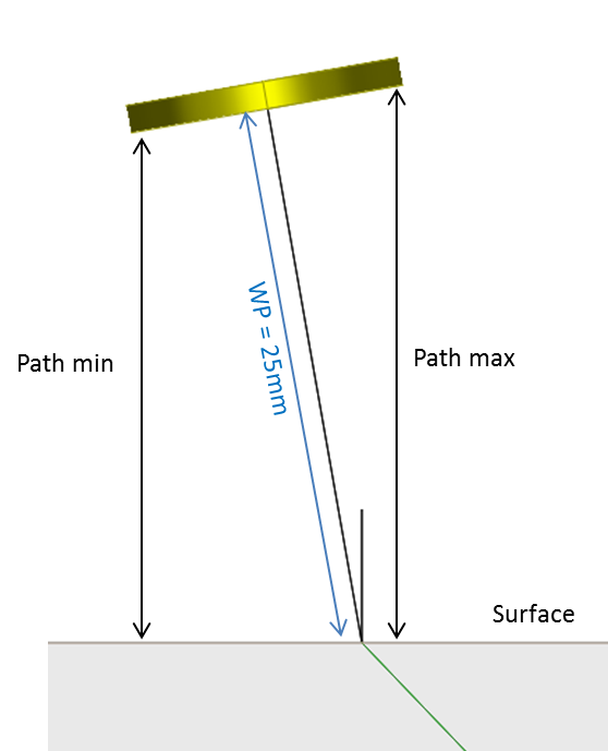 The signals simulated by the specular model are in good agreement with the measured results, except for the incidence of 10° for which the signal shape is very complex. From the beam steering of 16°, two clearly separated angular contributions appear. The times of flight of both contributions correspond to the paths of the normal rays of the specimen surface emitted by both probe extremities, as illustrated below.