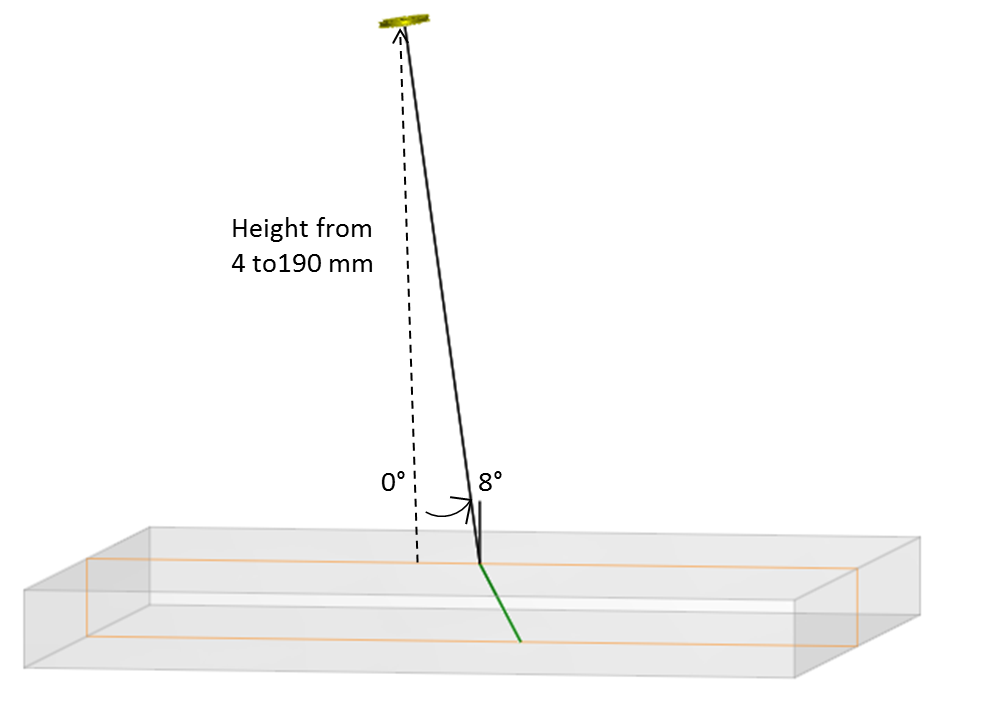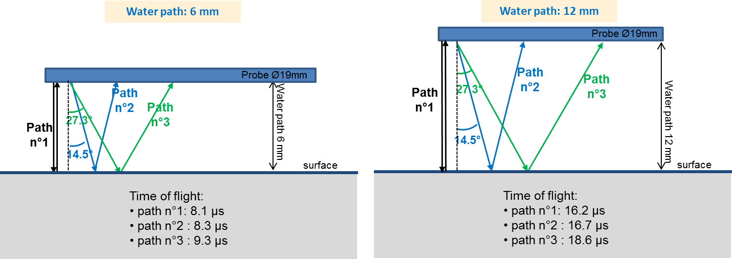 In order to evaluate the water path influence on the surface echo measurement during an immersion inspection, three immersion probes with different apertures are placed above a flat surface, at varying heights, from 4 mm to 190 mm, perpendicularly to the surface or slightly disoriented.