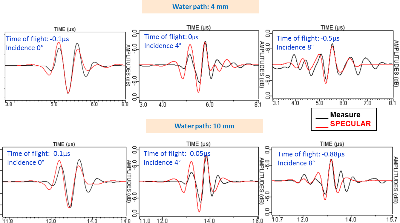 The normalized amplitude Ascans are represented here below for two water paths and three different incidence angles, the red curve corresponds to the specular model and the black one to measurements.